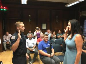 Firefighter Kevin Agrella was sworn in by Easton Town Clerk Danielle Sicard on Monday, Aug. 19.