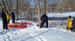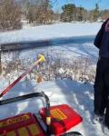 Firefighters responded with their ice rescue equipment, including an ice rescue sled and survival suits. Upon arrival, they observed a set of animal tracks leading toward a hole in the ice and another set of tracks leading away from the hole and off of the pond.