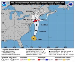 We are continuing to watch Henri. The storm track has taken a significant turn to the west in the latest forecast. This does not mean we are out of the woods yet though. There is still a chance of heavy rain and strong winds. The more west Henri tracks, the less impact it is on Easton. We will have another update tomorrow as the forecast gets further refined. Stay Safe!