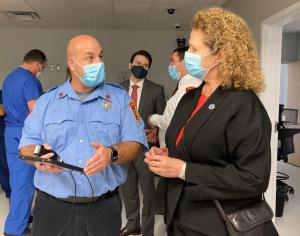 Lt. Jeff Dupuis (left) explains to Rep. Carol Doherty how the department’s new ultrasound diagnostic equipment will be used by paramedics while at the PC Institute for Medical Education on Wednesday, Oct. 13. (Photo courtesy Easton Fire Department)
