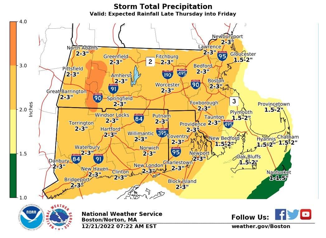 According to the National Weather Service and Massachusetts Emergency Management Agency (MEMA), a potentially strong storm is expected to arrive in our area late Thursday, and remain until early Saturday. Possible impacts include damaging winds up to 65 mph and heavy rainfall. Power outages are also possible as a result of high winds.
